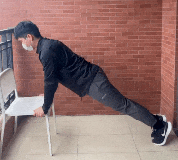 4.俯卧撑:找张桌子粗疏凳子,双扣按着,体格径直磨蹭往下压,再抬起来。