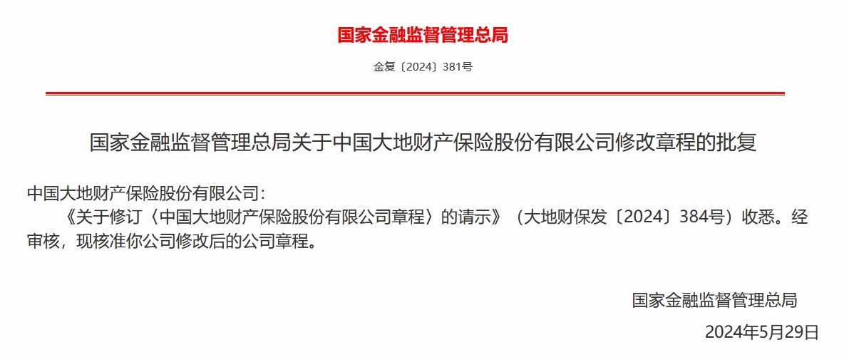 6月3日金融一线音信,国度金融监督搞定总局本日发布对于中国地面财产保障股份有限公司修改法子的批复,核准你地面财险修改后的公司法子。