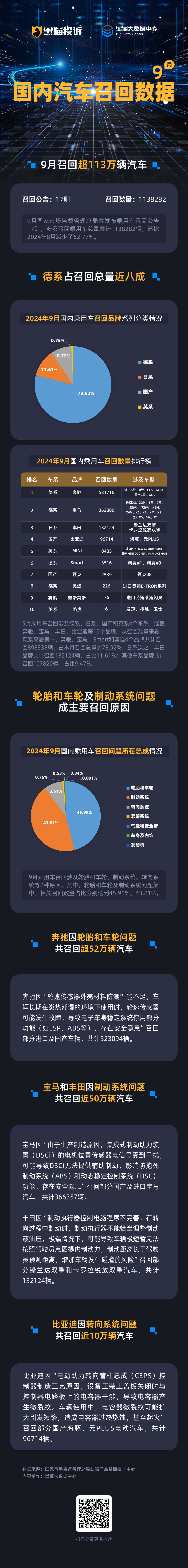 黑猫大数据中心凭证国度阛阓监督搞定总局于2024年9月份发布的国内乘用车调回公告联系数据,带铺张者举座追想9月份汽车调回情况。
