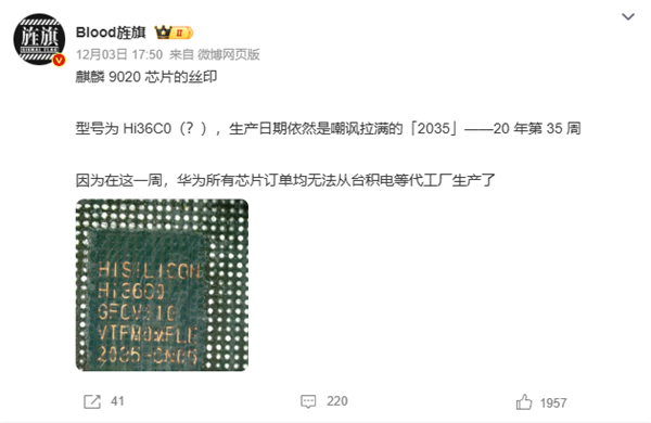 对于“2035”含义的大皆说法是:2020年第35周起,华为芯片订单均无法从台积电等代工场分娩。